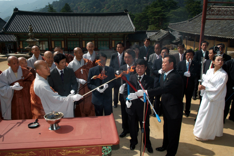 군민체육대회 성화를 채화 중인 문을주의장